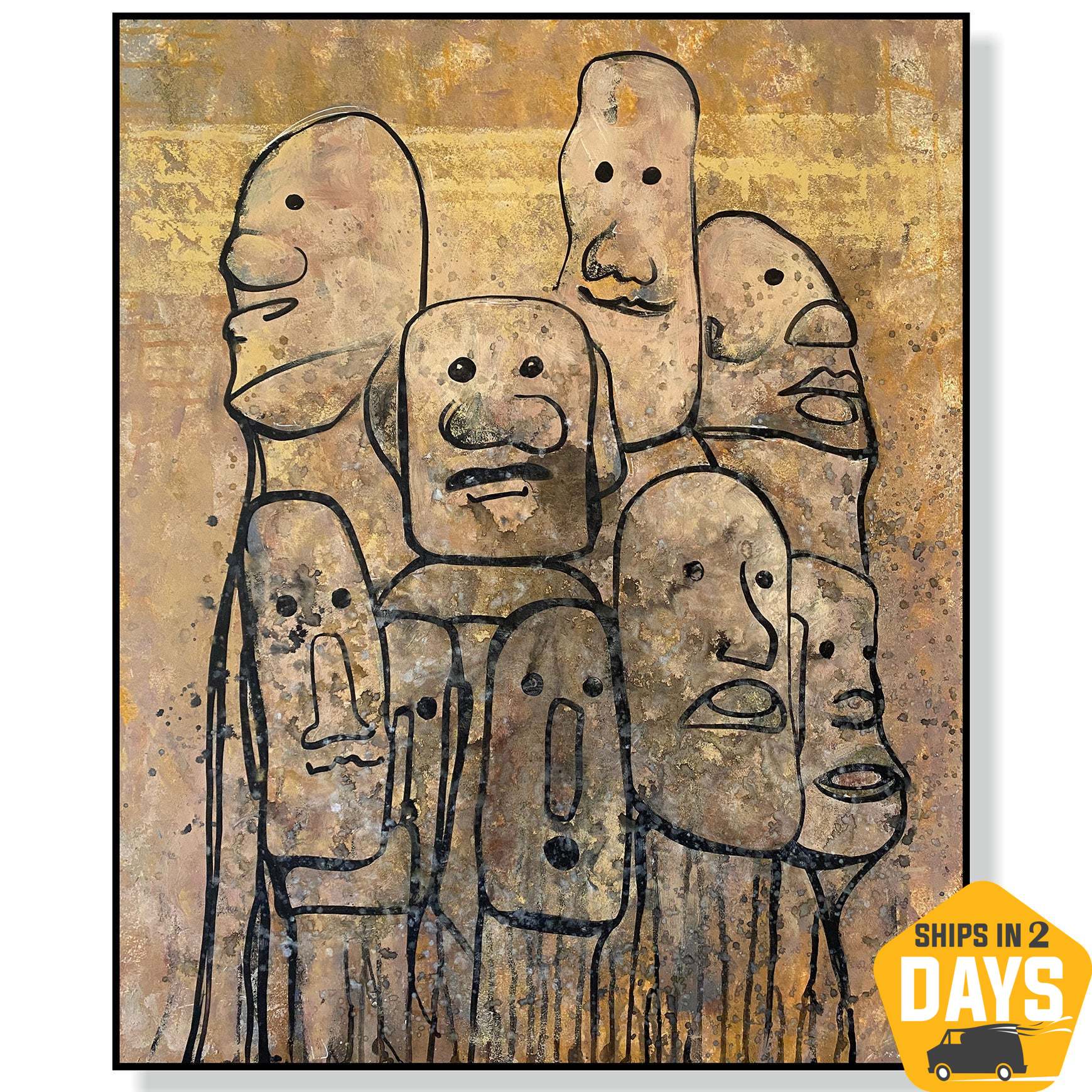 This abstract painting features a group of expressive faces rendered in muted earth tones, creating a surreal and primitive atmosphere. The minimalist figures, defined by bold lines and subtle dripping paint effects, evoke a sense of collective identity and emotion. Perfect for modern interiors, this unique figurative art piece adds depth and intrigue to any space. Ideal for lovers of abstract portraiture, tribal art, and contemporary decor, this artwork brings a powerful visual statement to your walls.