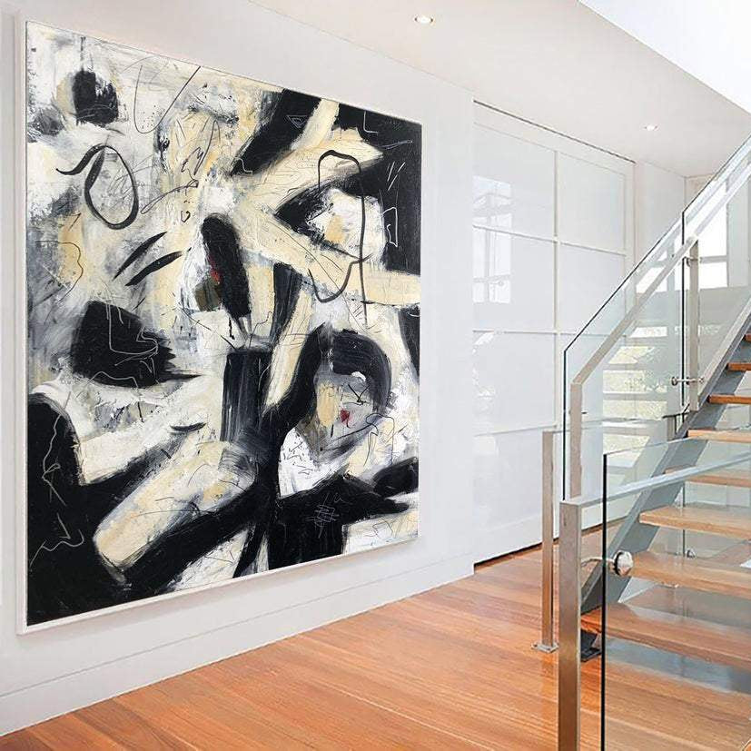 This black and white abstract painting was created by me as a metaphor for the infinity of changes in the worlds within us and around us. In this case, the cosmos symbolizes not only the real outer space, but also our inner cosmos of meanings, feelings and sensations. I used sharp broad black strokes and white and beige strokes and added minimal color accents. Thin graphic lines, one of my favorite elements in abstract painting, are reminiscent of profile portraits, outlines of objects, contours of landscapes. It attracts the eye and makes the viewer think while looking at the artwork.