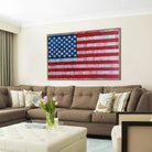 It shows a close-up of an American flag painted in a loose and expressive style. The paint appears to be dripping down the canvas in some areas. The red and white stripes and blue background are all clearly visible, but the brushstrokes are thick and the colors are not evenly applied.
