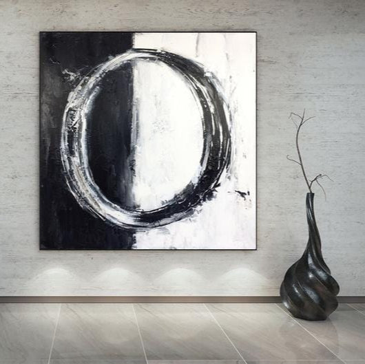 Introducing 'Inverse Circle,' a striking abstract art piece that features a bold circular motif set against a black and white background. This large canvas painting embodies the essence of modern and minimalist design, creating a dynamic visual contrast that is perfect for contemporary decor. The simplicity of the monochrome palette combined with the powerful circular shape makes it a captivating addition to any living room, office, or space seeking a touch of abstract elegance and energy.