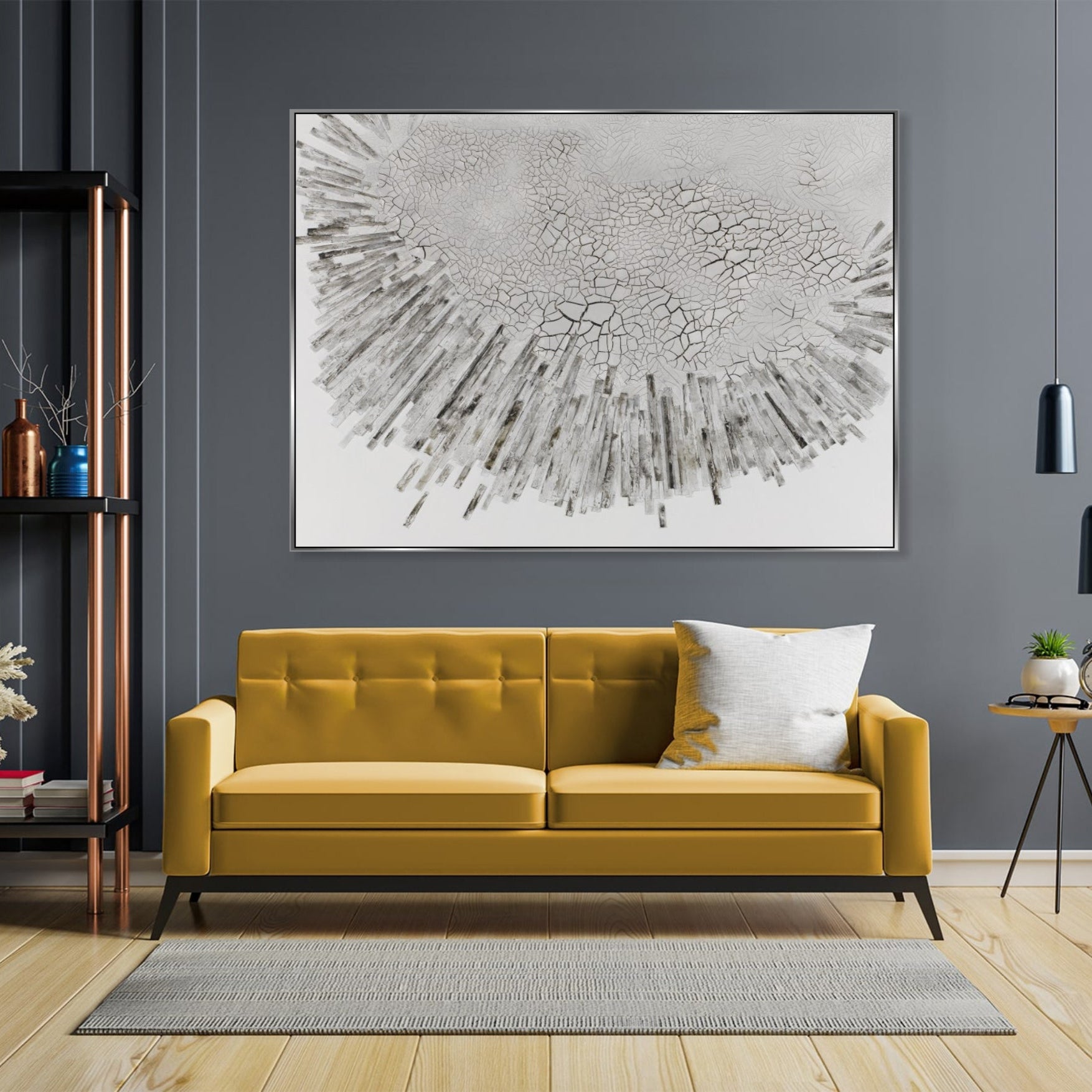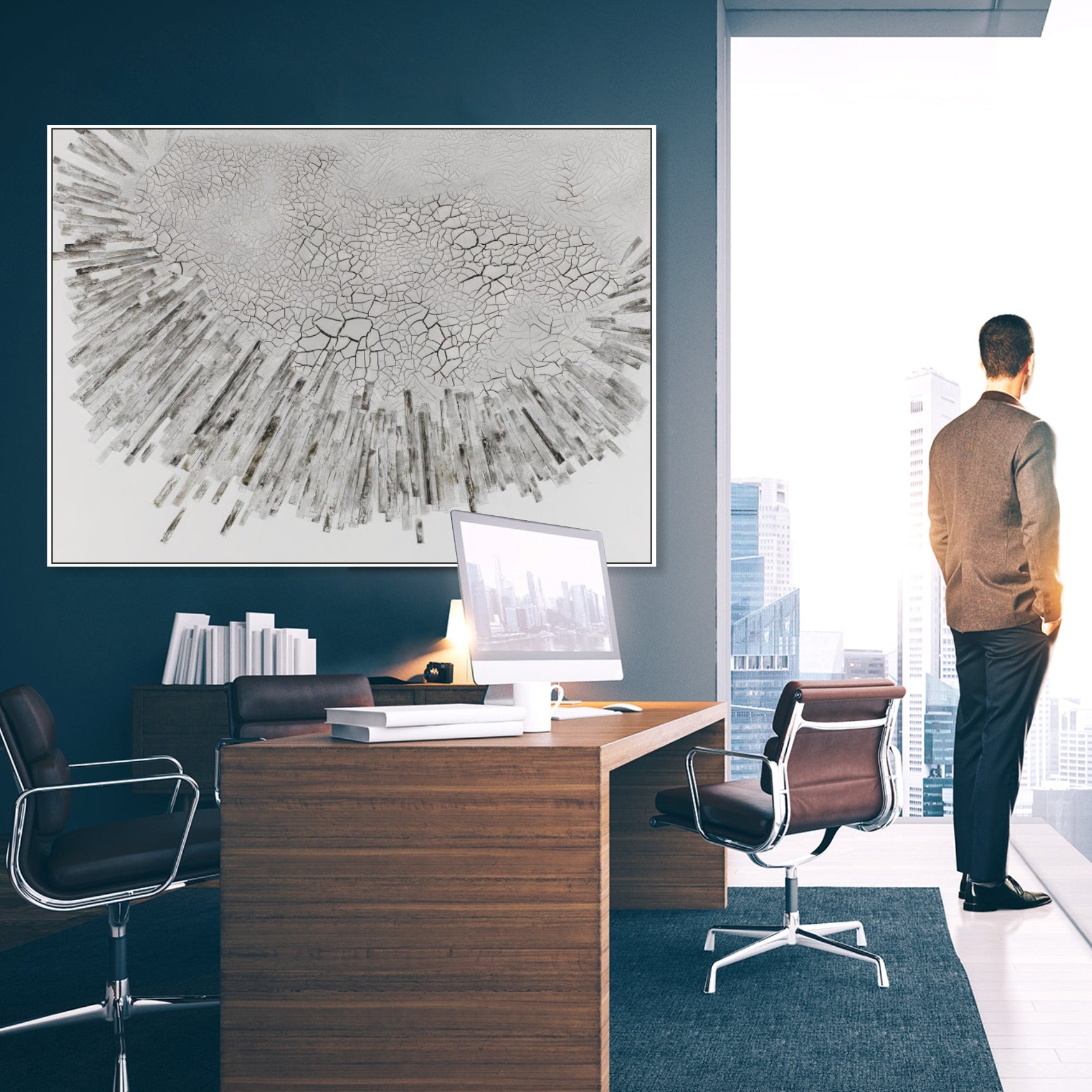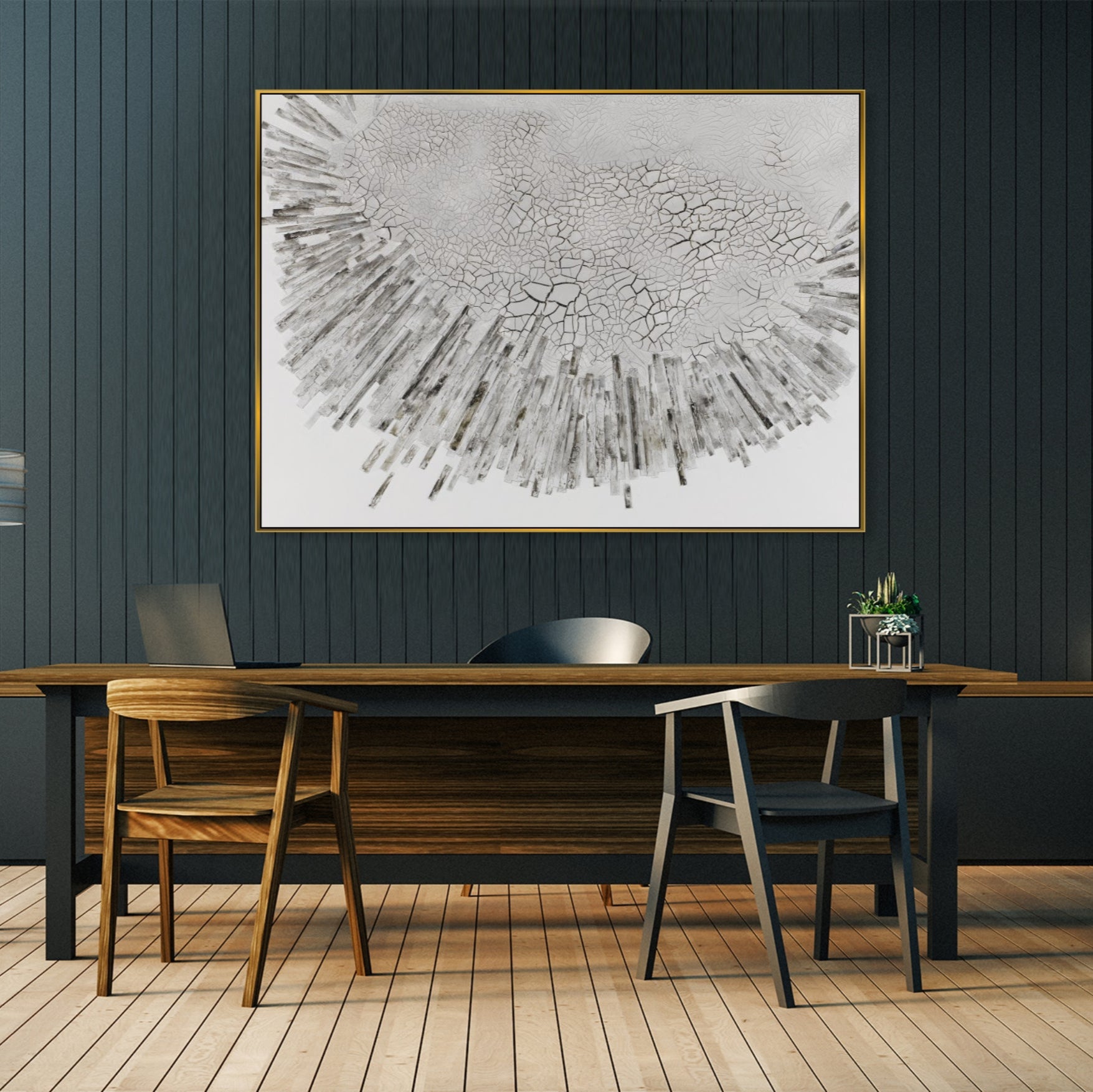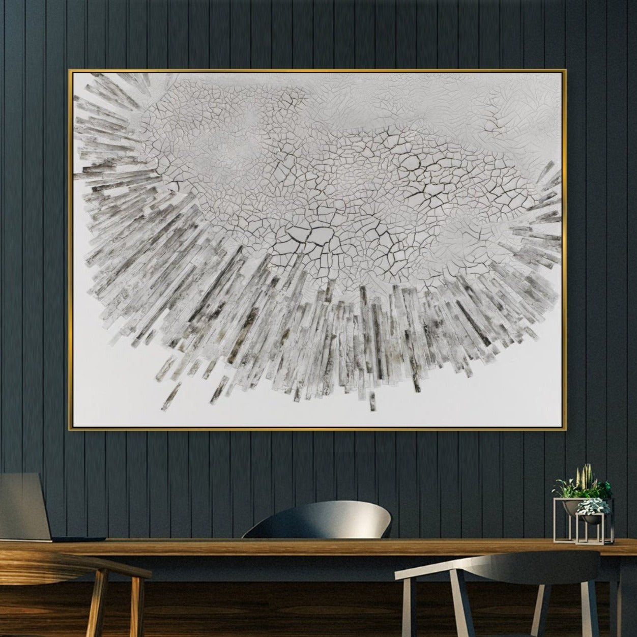 "Monochrome Cracks" captures the raw beauty of nature-inspired textures in a stunning monochrome palette. This abstract artwork features a mesmerizing interplay of cracked patterns and striated textures, evoking the fragile yet enduring beauty of natural forms. Perfect for modern and minimalist decor, it offers a tranquil and sophisticated aesthetic that complements any space. The artwork's delicate details and subtle contrasts create a visual depth that invites contemplation, making it a captivating addition to both home and office environments. Elevate your interior with this piece that harmoniously blends art with the essence of nature.