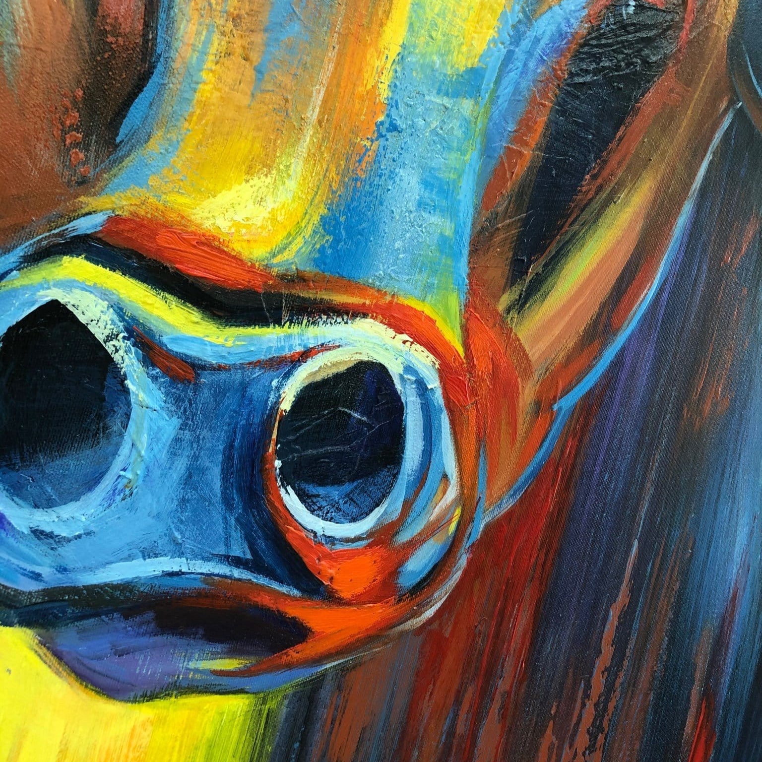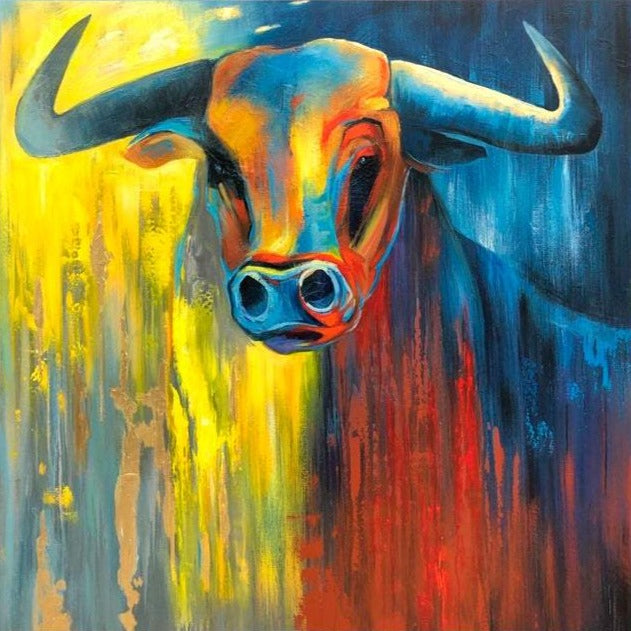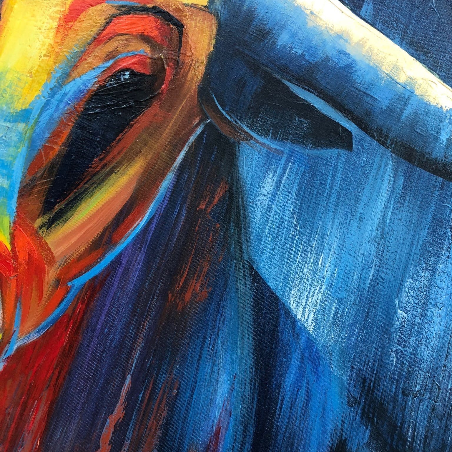 "Eyes of Beauty" is a captivating and vibrant depiction of a bull, brought to life through a dynamic palette of bold colors. The painting combines intense blues, fiery reds, and radiant yellows, creating a striking contrast that highlights the strength and majesty of the animal. The bull's gaze is powerful and mesmerizing, drawing the viewer into its world. The flowing colors and expressive brushstrokes convey a sense of energy and movement, capturing the essence of the bull's spirit. "Eyes of Beauty" is a celebration of both the raw power and the inherent grace found in nature, inviting viewers to appreciate the magnificence of this magnificent creature.