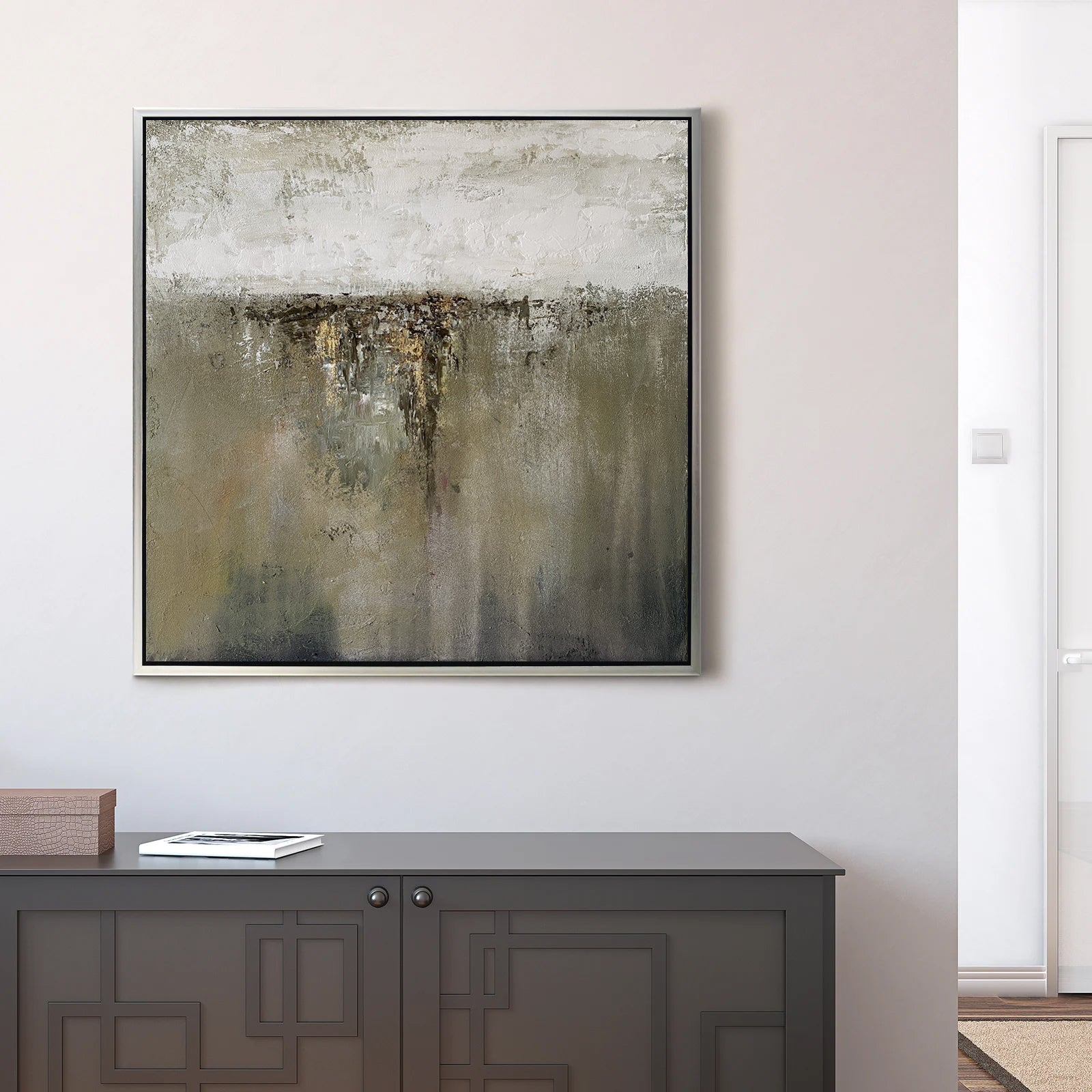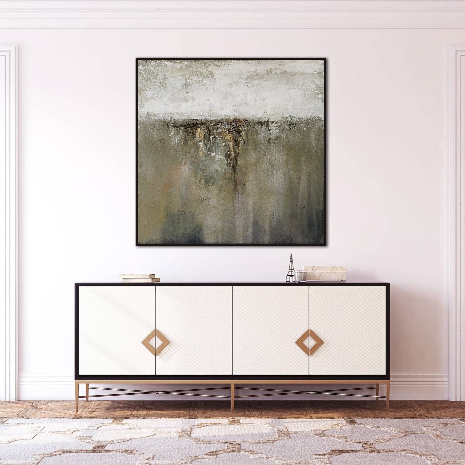 Breathe calm into your space with this neutral textured abstract landscape. Hand-built impasto adds movement in olive, taupe and greige, grounded by charcoal and kissed with a subtle gold accent. The minimalist horizon suits modern, Scandi and wabi-sabi interiors, creating a serene focal point above sofa, bed or console. Gallery framed and ready to hang, this large canvas elevates living room, bedroom or office with earthy luxury and timeless style.