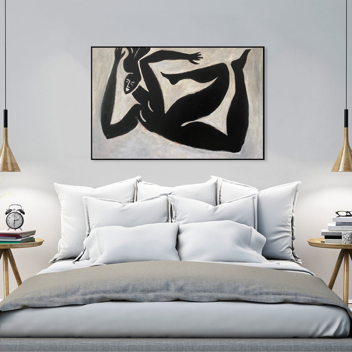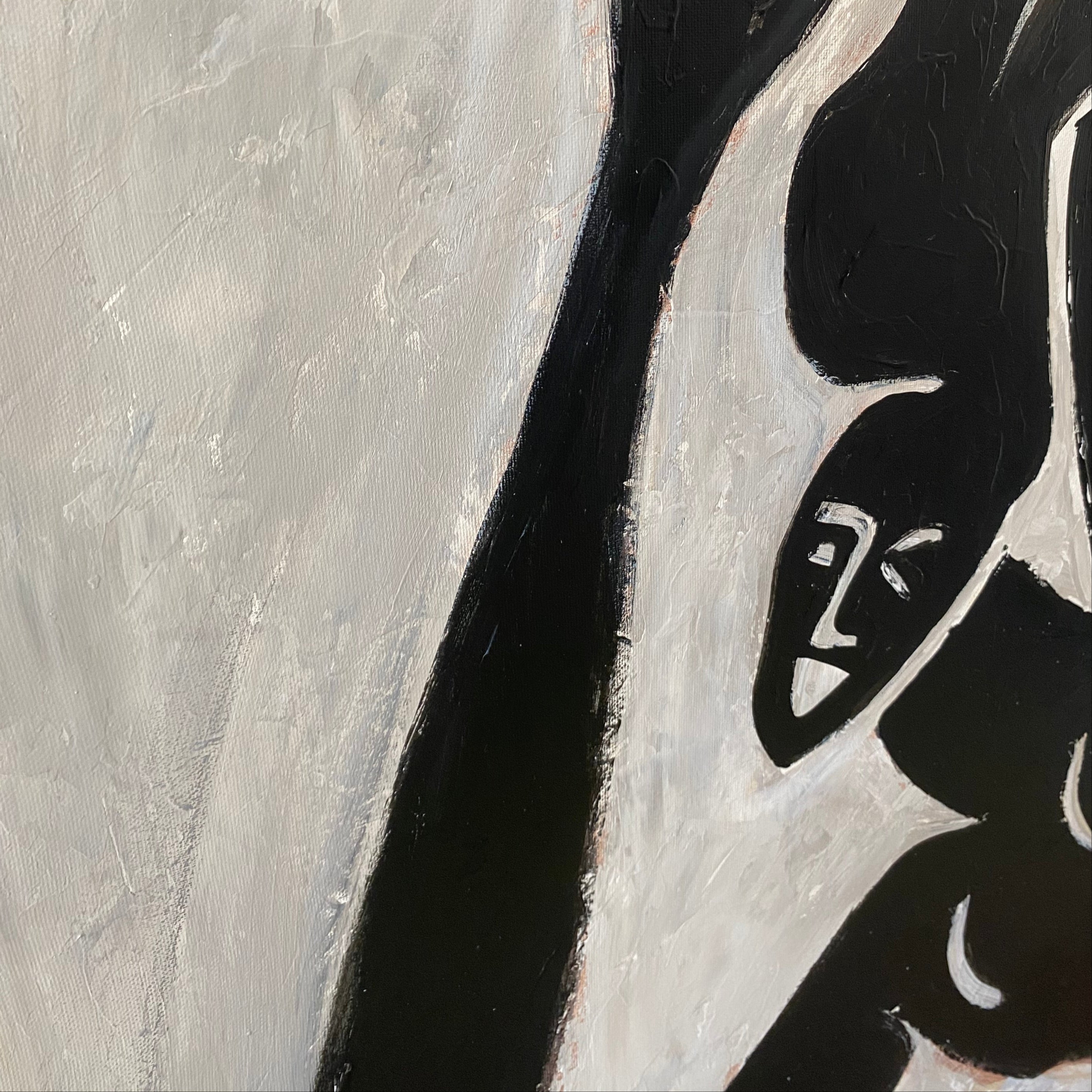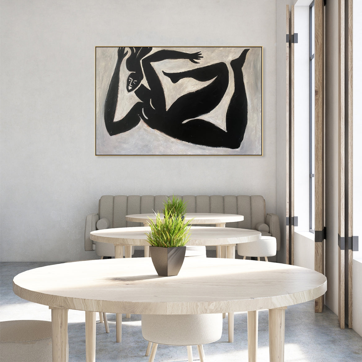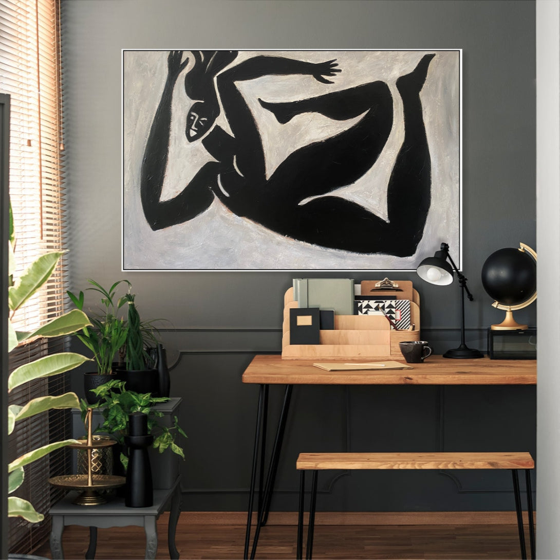 'Falling Throught' embodies the raw energy of motion and the grace of human expression in a minimalist abstract form. With its striking black figures against a beige canvas, it invites contemplation and serves as a bold statement piece for any modern space.