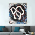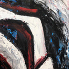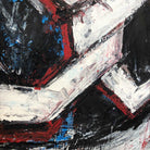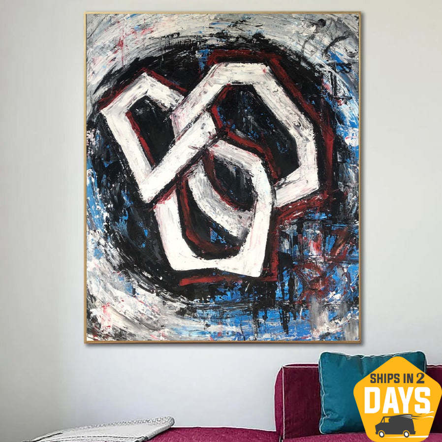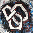 This painting features an abstract composition with interlocking hexagonal shapes outlined in white, set against a dynamic background of swirling black, blue, and red brushstrokes. The bold, textured lines create a sense of depth and movement, with the contrasting colors adding visual interest and intensity. The overall effect is striking and chaotic, evoking a sense of energy and complexity.