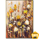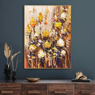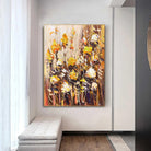 My original painting Golden flowers is woven from warm hues and unique autumn light. I didn't use any cool or neutral shades - just variations of yellow, beige, golden and orange for the main composition of my abstract artwork! This color choice infuses the entire art object with energy. Although I added color accents of purple and burgundy to add contrast and expressiveness to the background, this only strengthened the warm impression of the painting as a whole.