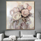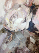 This painting portrays a delicate bouquet of roses in soft, pastel hues of pink, white, and beige. The brushstrokes are loose and impressionistic, giving the flowers a dreamy, ethereal quality. The muted background and subtle shadows enhance the romantic and gentle atmosphere, drawing attention to the intricate beauty of the roses.