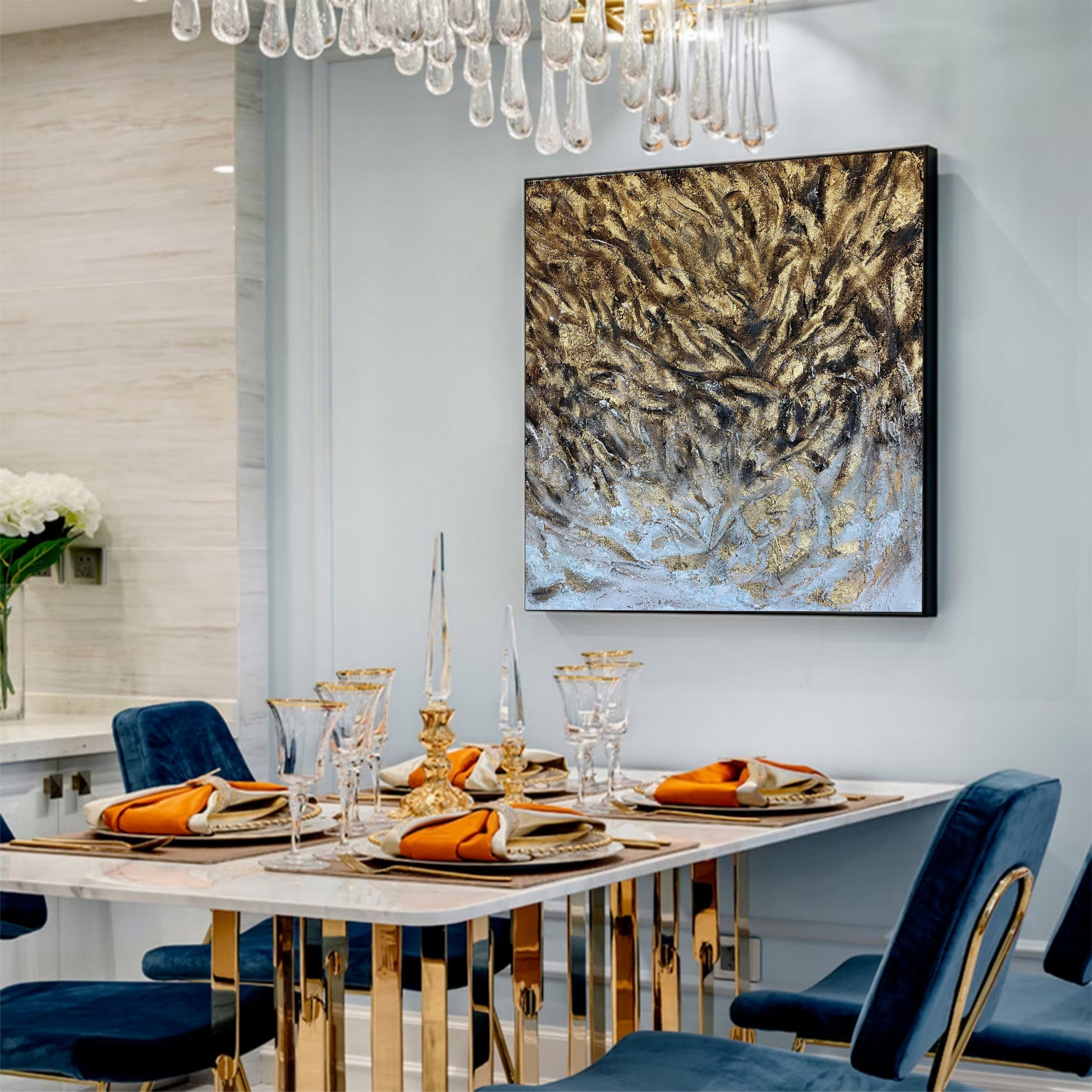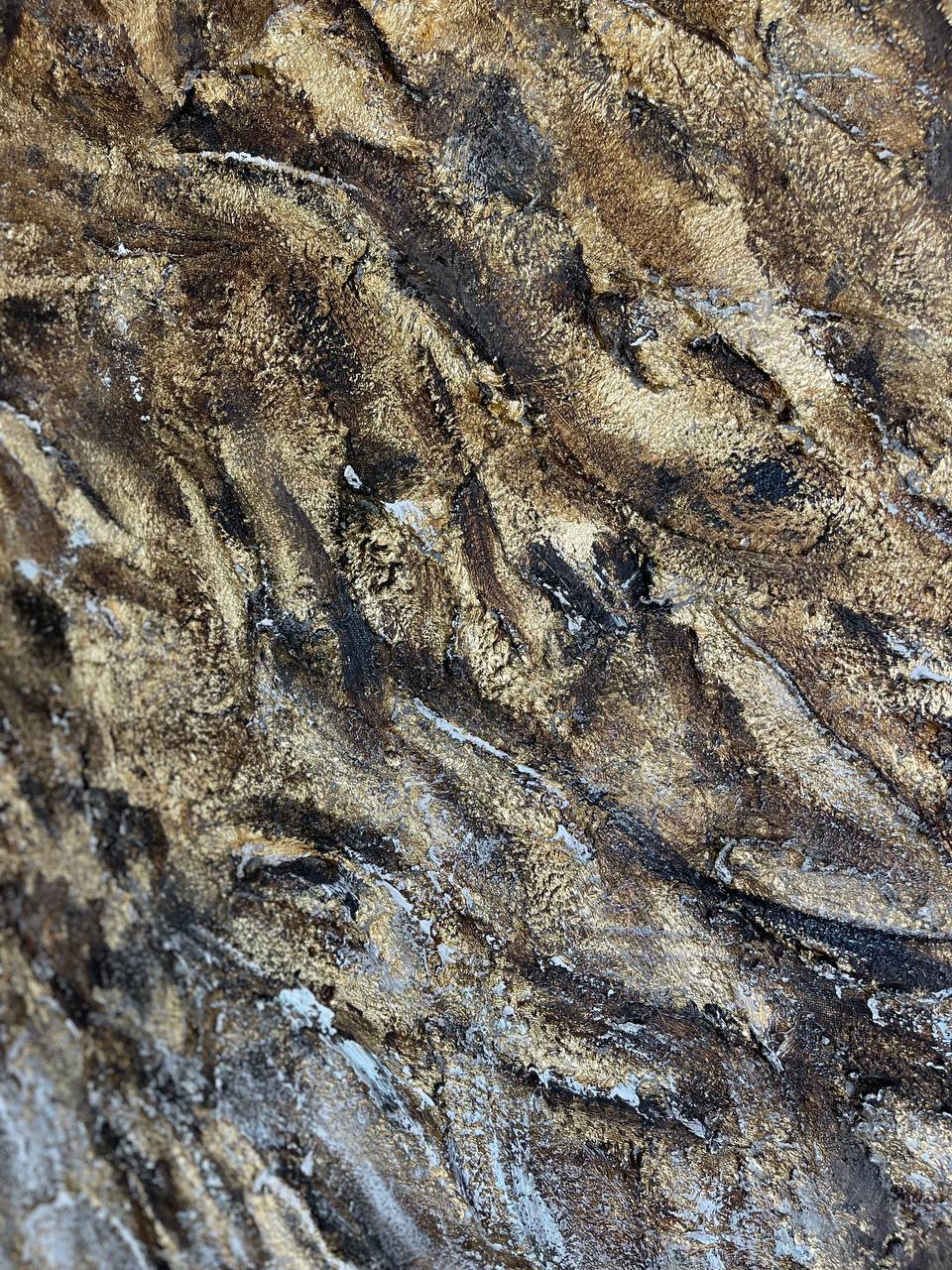 This painting features an abstract, textured design with a rich blend of gold, brown, and black hues. The swirling patterns create a sense of movement and depth, reminiscent of natural elements like leaves or feathers. The bottom portion transitions into lighter tones of blue and white, providing a striking contrast that enhances the overall dynamic composition.