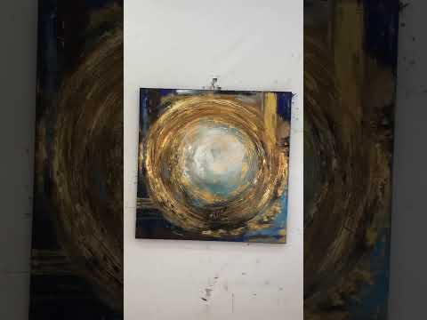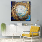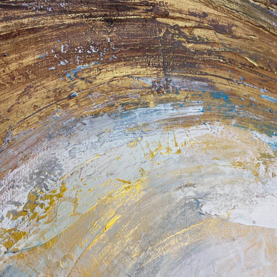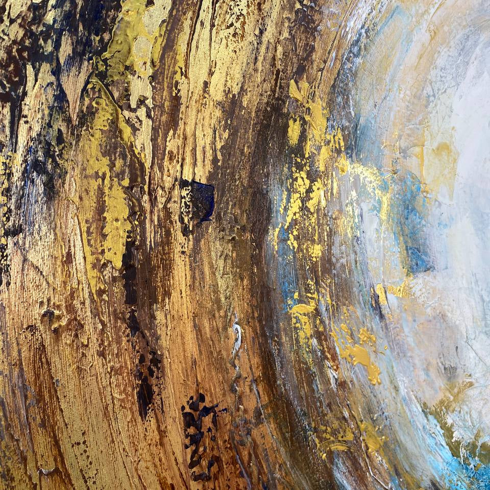 This mesmerizing abstract painting evokes a sense of cosmic energy and celestial beauty. At its core, a radiant sphere of light, swathed in ethereal blues and whites, seems to pulse with an otherworldly glow. Surrounding it, dynamic swirls of rich golds and earthy browns create a sense of movement and depth, drawing the viewer into its luminous center. The interplay of textures and colors suggests a powerful, almost mystical, convergence of elements, capturing the infinite dance of creation and the timeless essence of the universe. This artwork is a captivating focal point, infusing any space with a sense of wonder and tranquility.