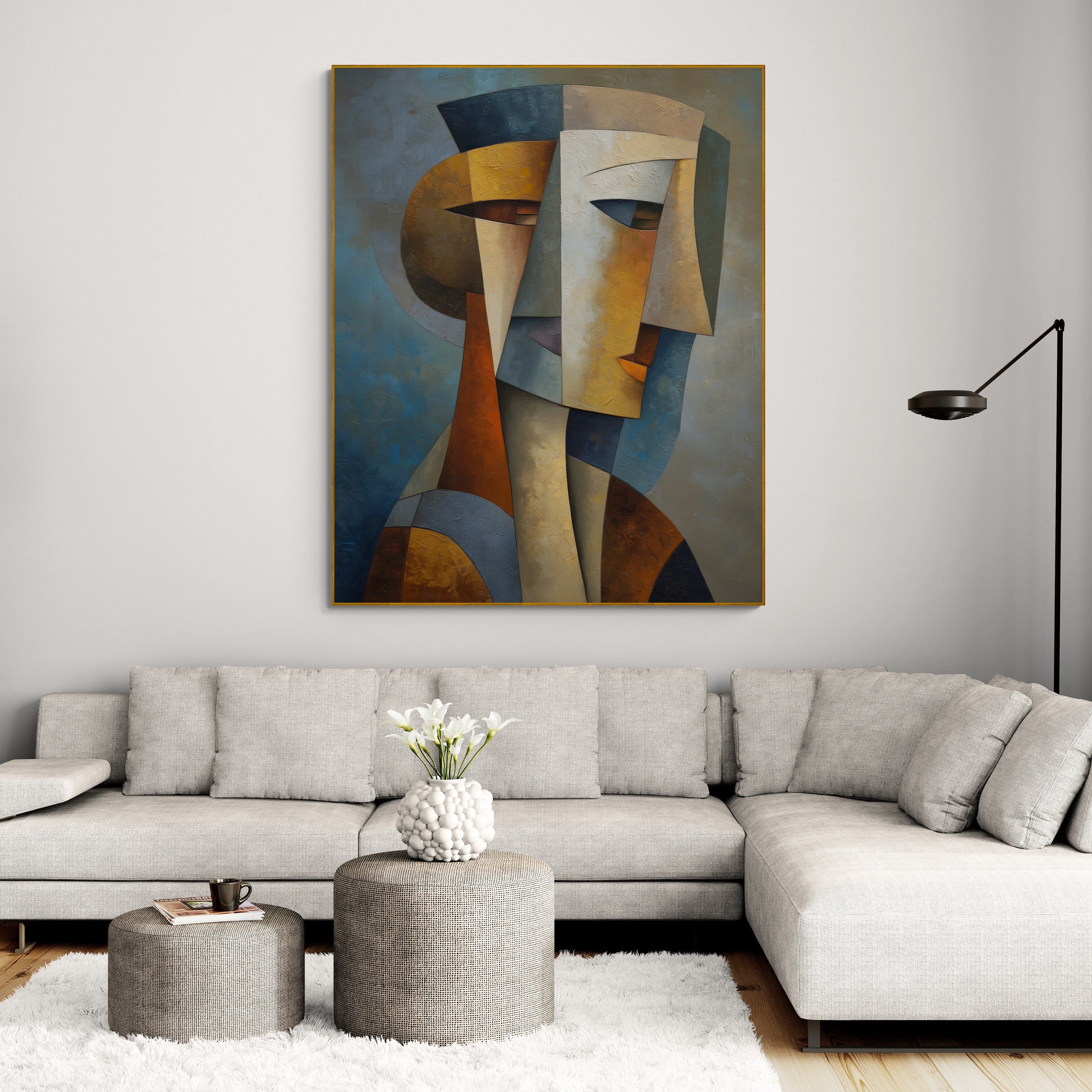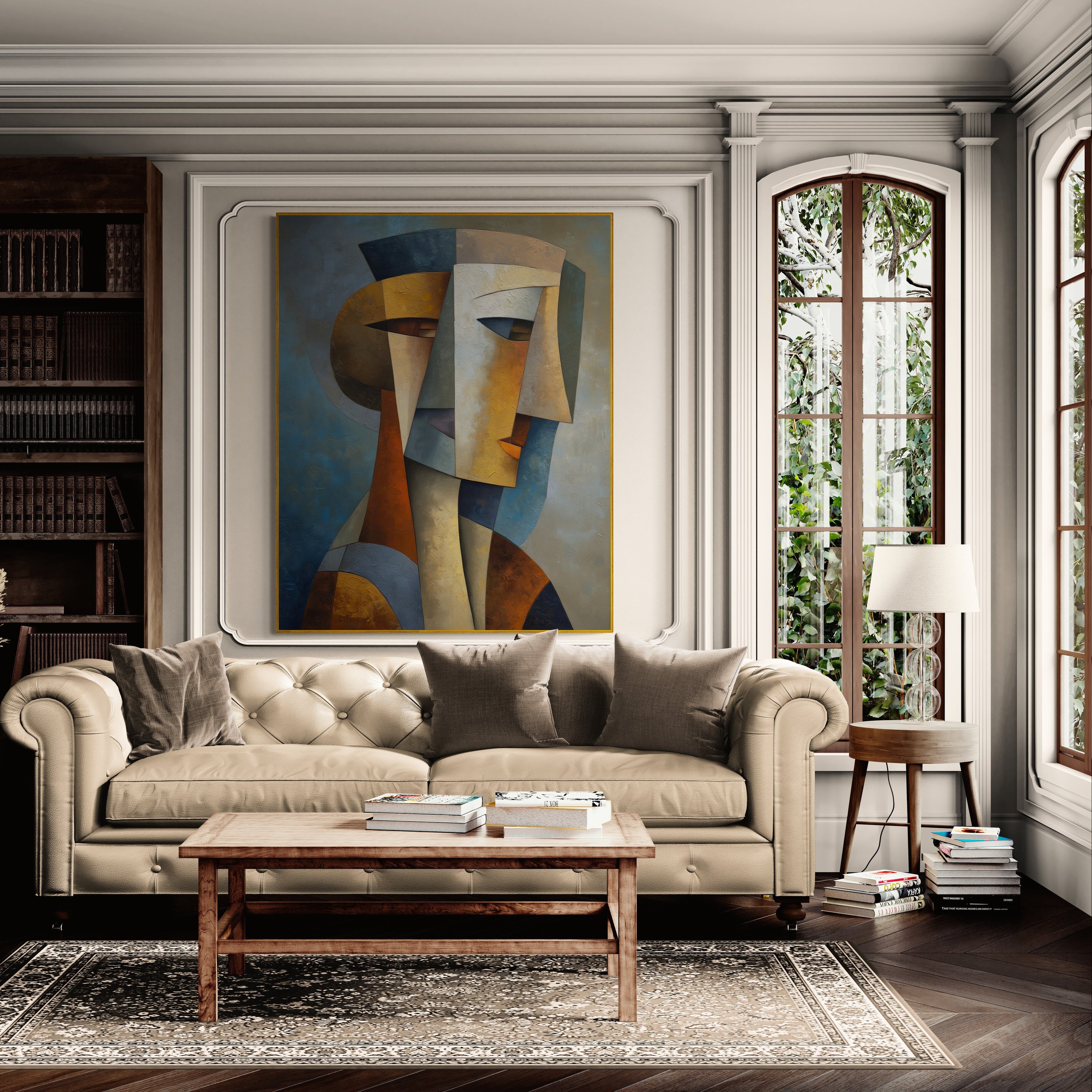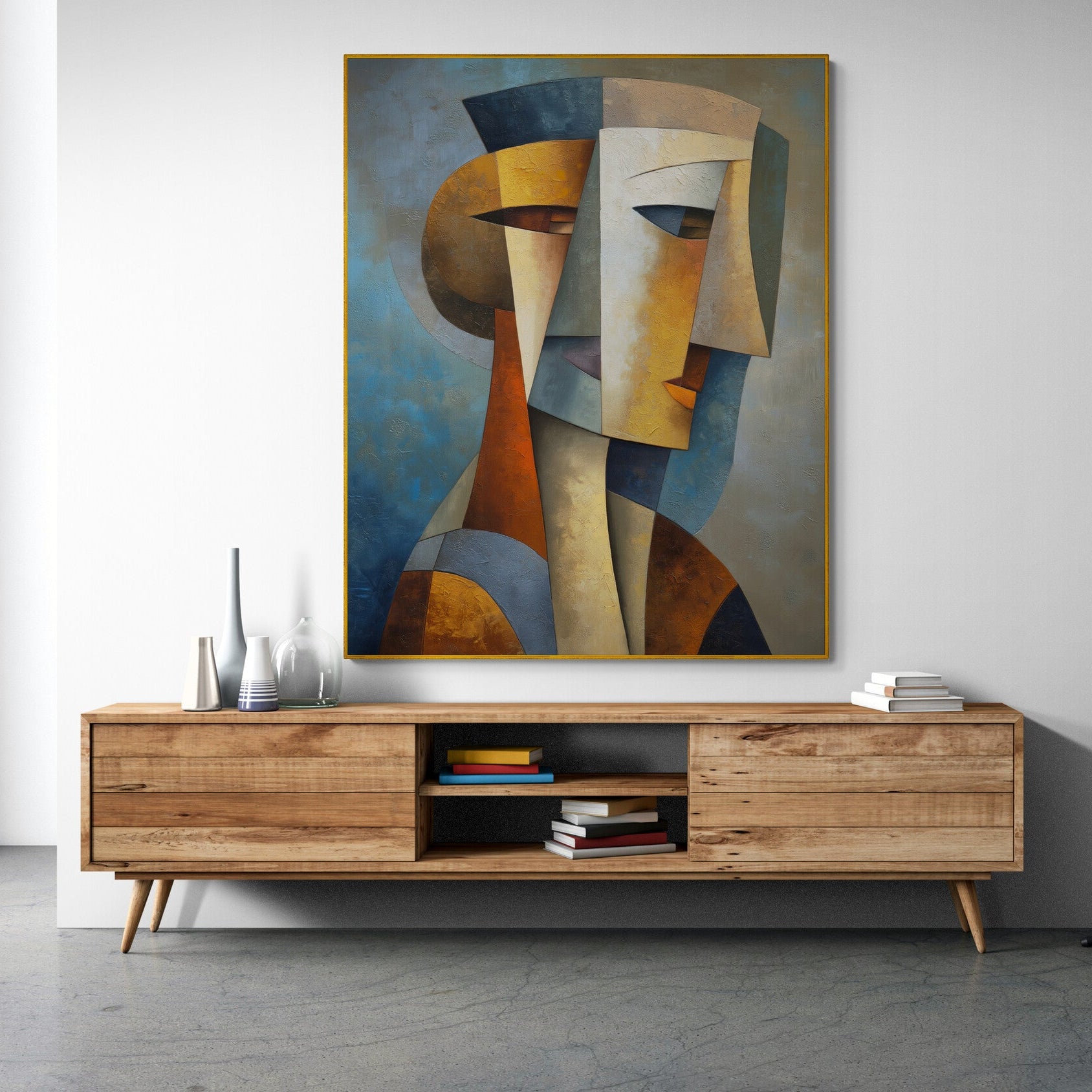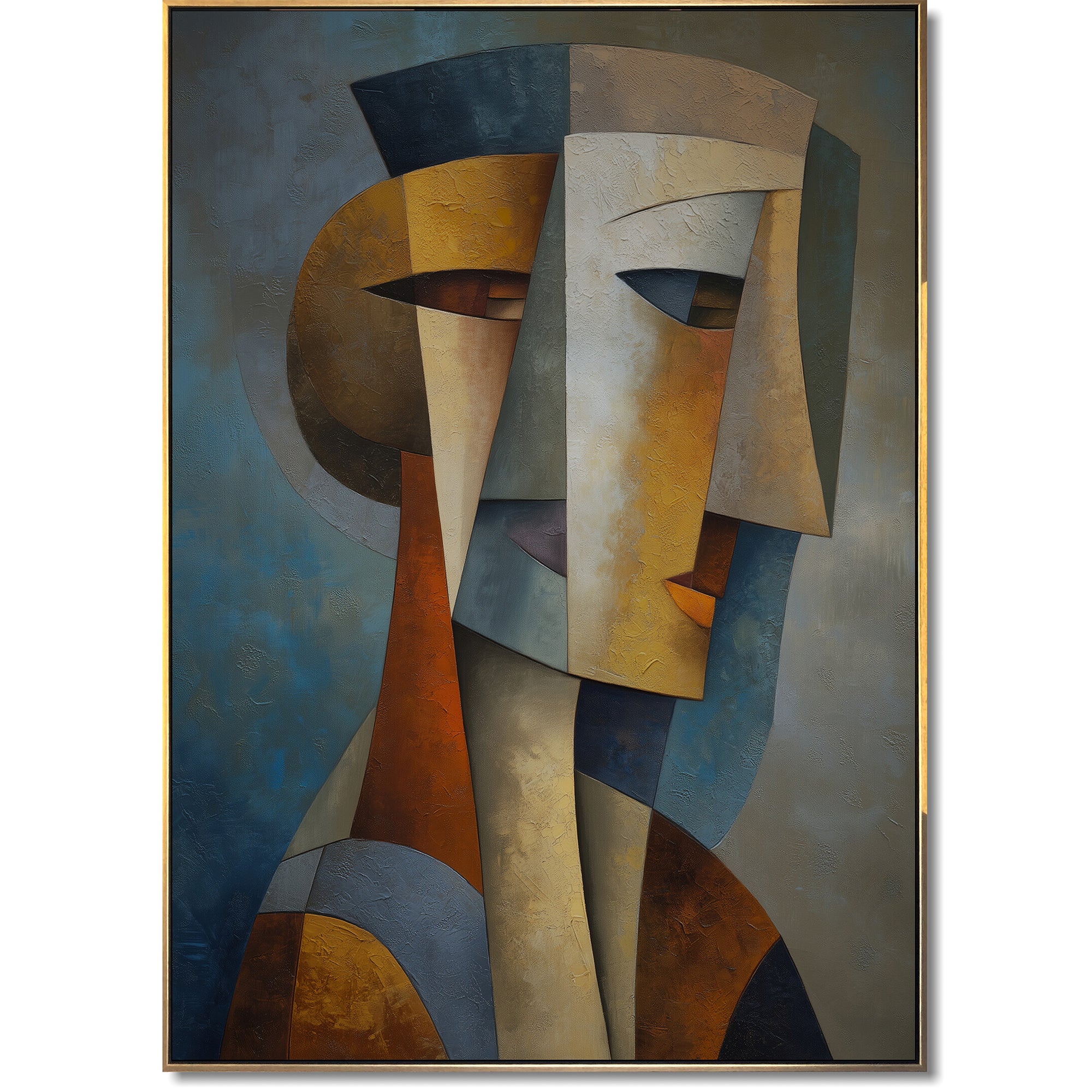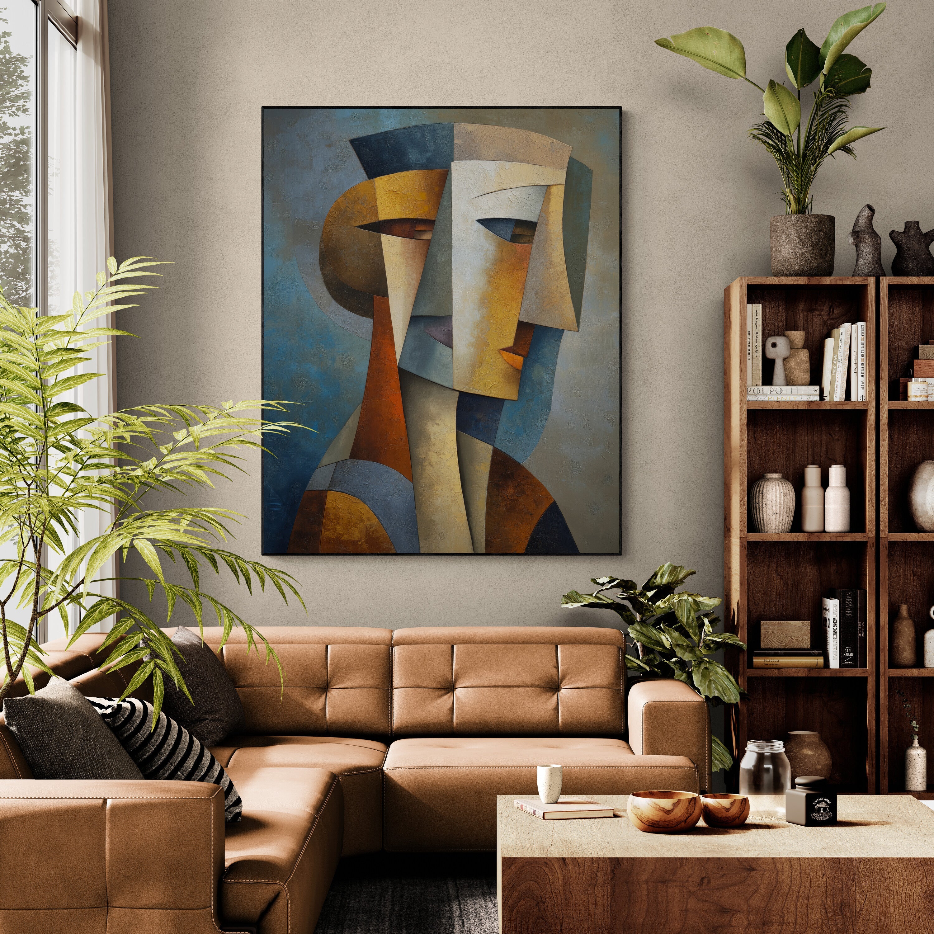 A striking geometric cubist portrait hand-painted with rich earthy tones — perfect for entryways, offices and modern homes. Add a bold artistic accent to your space — shop now and elevate your decor!