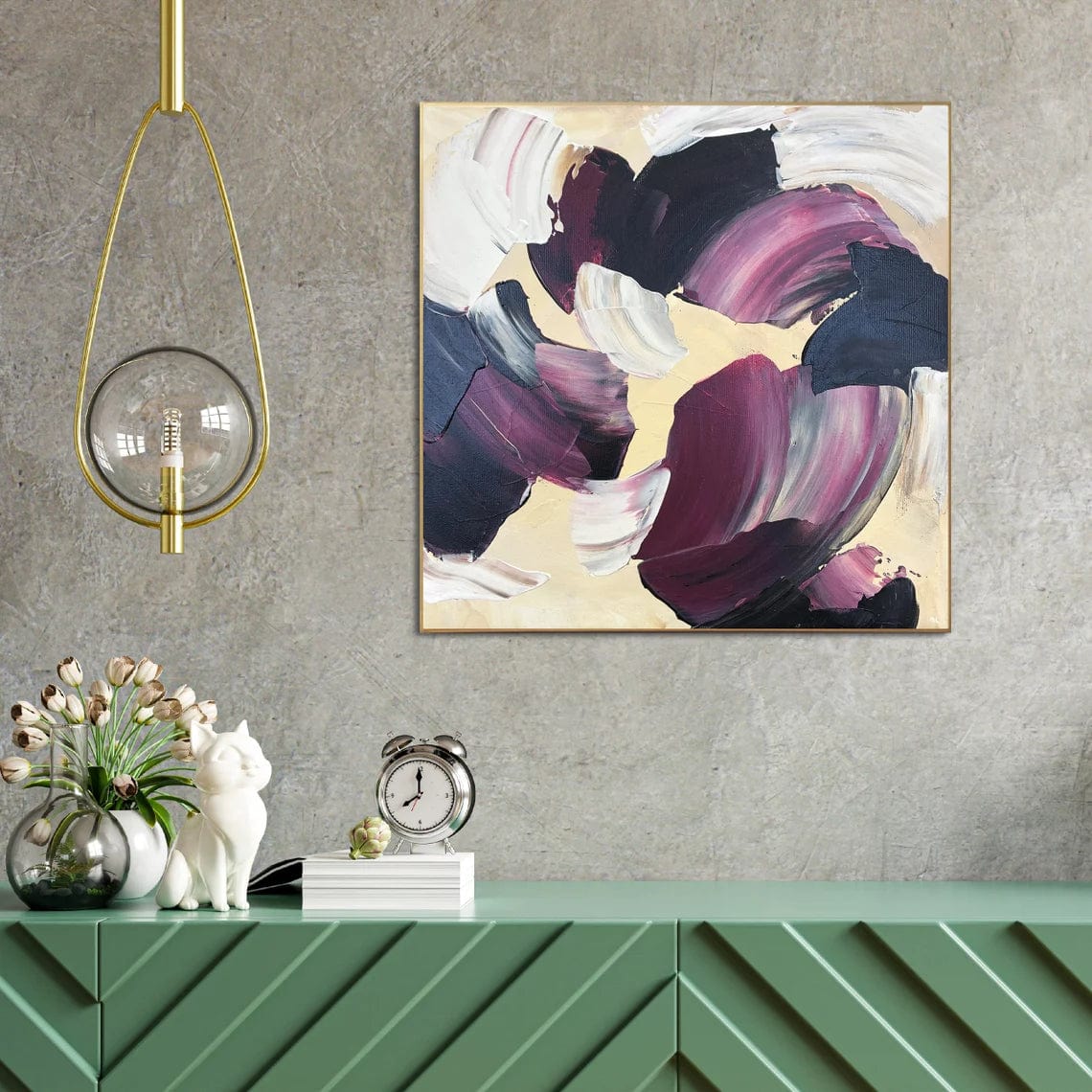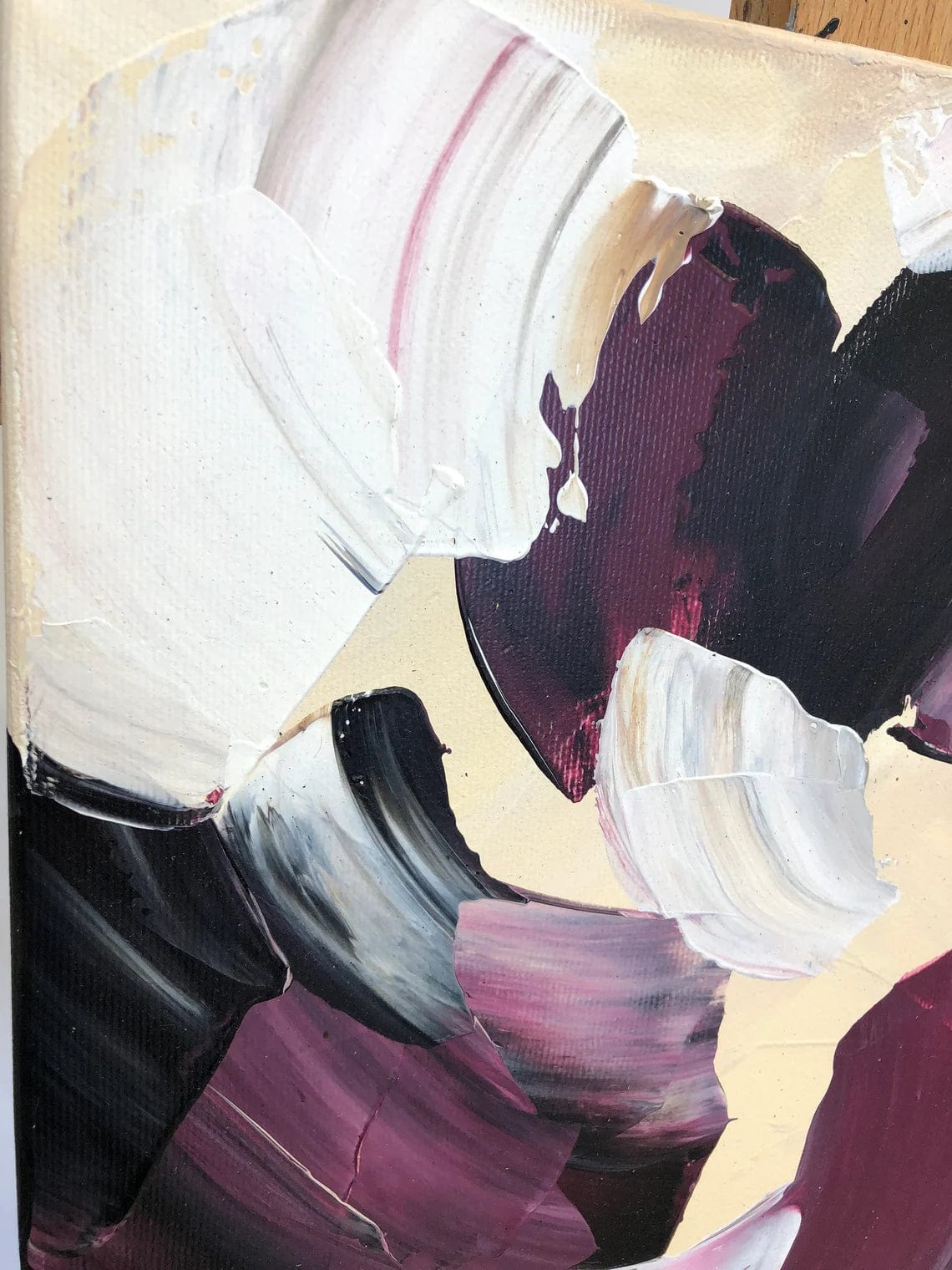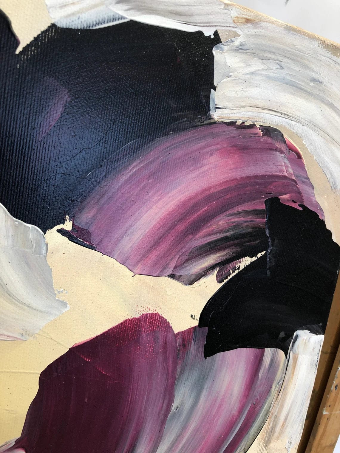 This abstract painting features bold, sweeping brushstrokes in deep purples, blacks, and whites, creating a dynamic and energetic composition. The curved lines and contrasting colors give a sense of movement and intensity, drawing the viewer's eye around the canvas. The beige background provides a neutral base, allowing the vibrant, layered strokes to stand out prominently.